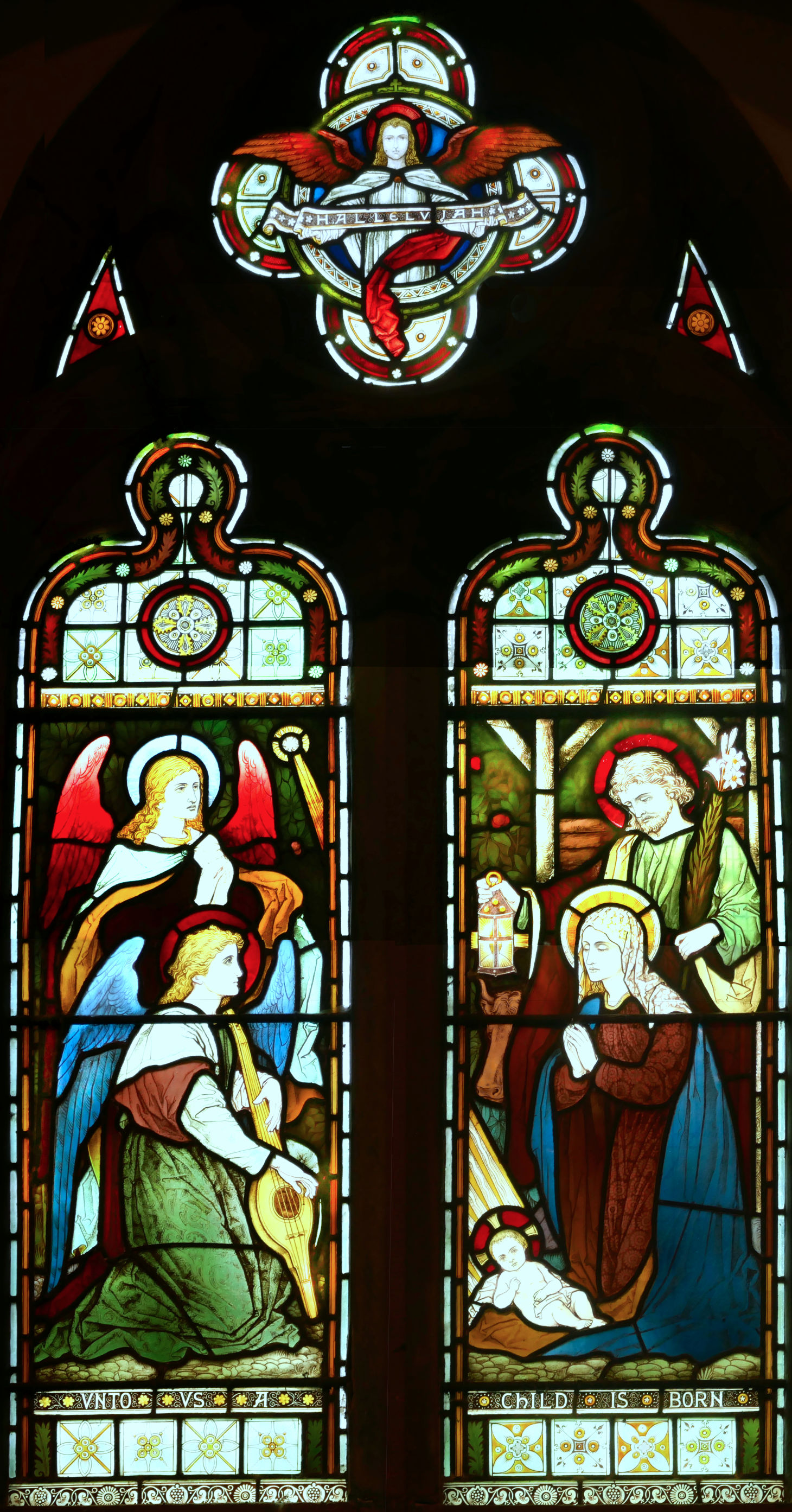 The west window on the north side of the nave depicts Joseph, Mary and two angels in adoration of the infant Christ. The Angel in the quatrefoil above holds a banner inscribed “Hallelujah”. It is interesting to note that it differs from other similar quatrefoils in the church in that the Hebrew way of spelling the word is used here