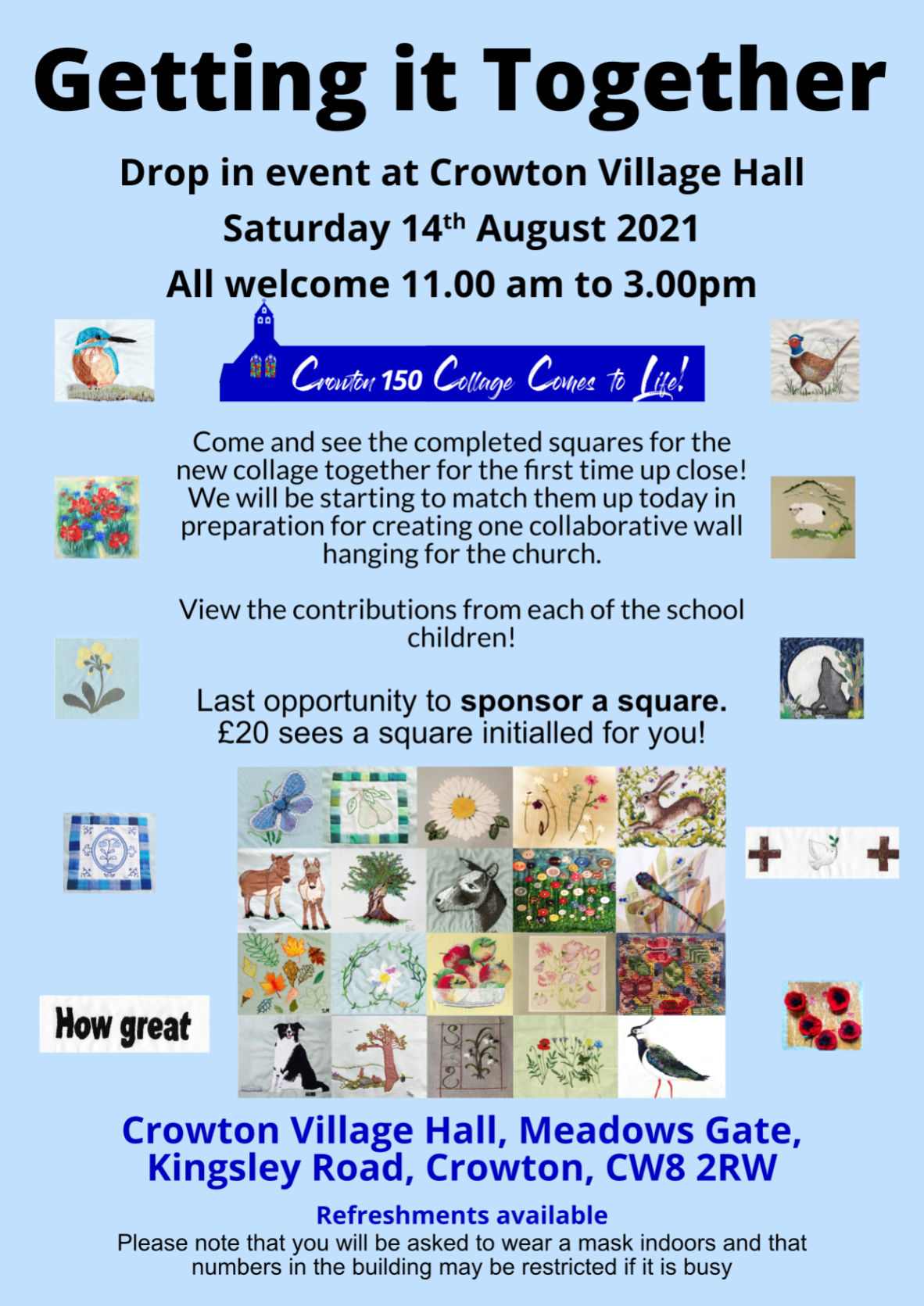 150 unique individual squares have been stitched, knitted, felted, beaded and otherwise crafted. On 14th August we brought the animals, birds, flowers, insects and other living things together for the first time: quite literally All Things Bright and Beautiful!