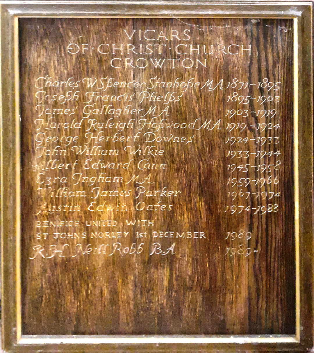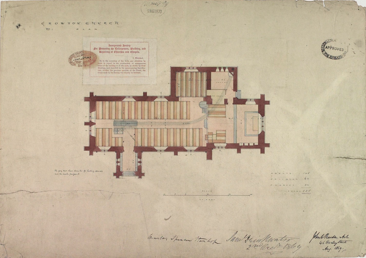 Designed in the Gothic Revival style by Sir John Loughborough Pearson RA., FSA., the church was consecrated on the 2nd November 1871 by William, Bishop of Chester. A copy of the original plan dated 1869 can be seen above (click to enlarge). It is signed by the then vicar of Weaverham who carved out the parish from his Weaverham benefice to provide a living for his son, Charles William Spencer-Stanhope as Crowton's first vicar. Its three bells were named Faith, Hope and Charity.